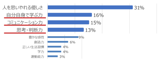 また、パナソニック ホームズが、戸建住宅の検討意向者を対象に実施した調査※1においても、設問「子どもに最も身につけてほしいこと」の多数回答は、「人を思いやれる優しさ」(31%)に次いで、「自分自身で学ぶ力」(16%)・「コミュニケーション力」(15%)・「思考・判断力」(13%)が続いています。