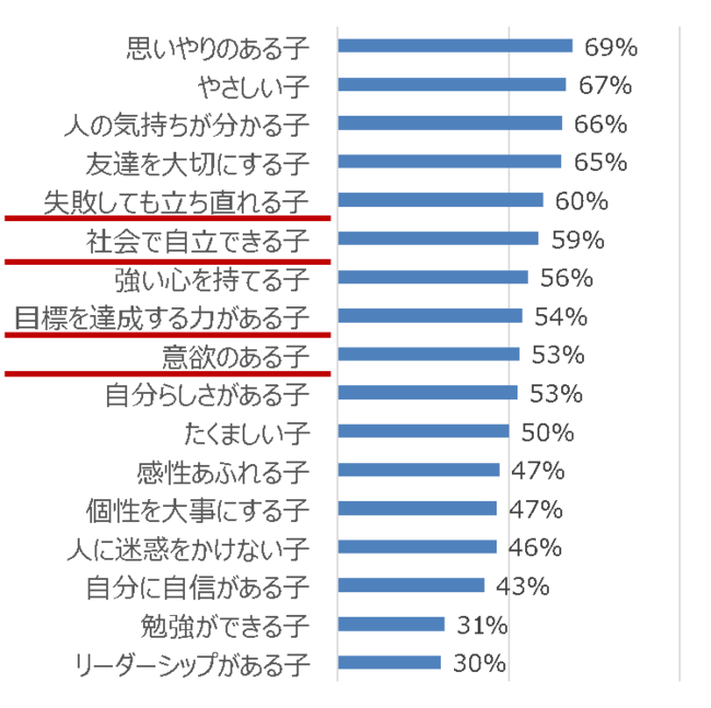 また、設問「どのような子どもに育ってほしいと思うか」では、過半数が「失敗しても立ち直れる子」(60%)・「社会で自立できる子」(59%)・「目標を達成する力がある子」(54%)・「意欲のある子」(53%)と回答しています。