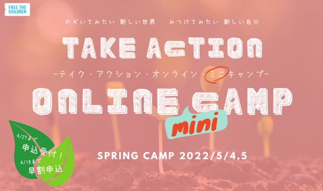 認定NPO法人フリー・ザ・チルドレン・ジャパン(所在地:東京都世田谷区南烏山6-6-5-3F、代表:中島早苗)は、小学5年生~高校3年生(またはこれに準ずる年齢の子ども)対象のオンライン研修イベント「テイク・アクション・オンライン・ミニキャンプ2022春」を2022年5月4~5日に実施いたします。ルワンダ内戦を生き抜いた経験をもつNPO法人ルワンダの教育を考える会代表の永遠瑠(とわり)マリールイズさんによるゲストトークをはじめ、ワークショップやディスカッションを通して、子どもたちが世界、社会に横たわるさまざまな問題解決のために行動する力を育みます。