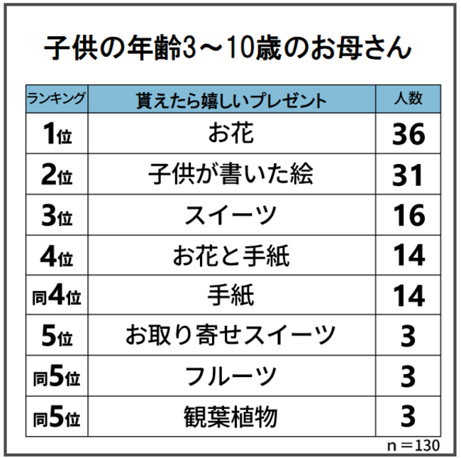 年齢が3歳から10歳のお子様をもつお母さんに「母の日にどのようなプレゼントを貰えたら嬉しいですか?」と質問したところ、1位が「お花」2位が「子供が書いた絵」3位が「スイーツ」の結果となりました。