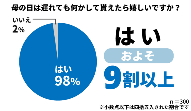 「母の日は遅れても何かしてもらえたら嬉しいですか?」とお母さん300人に質問したところ、なんと98%のお母さんが「はい」と回答されました。