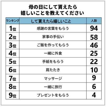 プレゼントを貰う側の立場にあるお母さん300人に、「母の日にして貰えたら嬉しいこと」を記述式で回答頂きました。