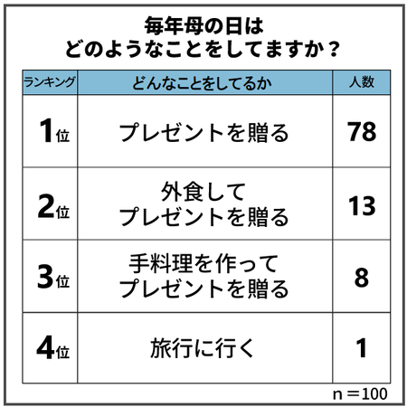 男女100人に「毎年母の日にどのようなことをしていますか?」と質問したところ、9割以上の方が母の日にプレゼントを贈っていらっしゃいました。