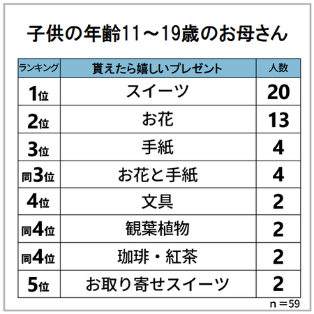子供の年齢が11歳から19歳のお母さんに「母の日にどのようなプレゼントを貰えたら嬉しいですか?」と質問したところ、1位が「スイーツ」2位が「お花」3位が「手紙」の結果となりました。