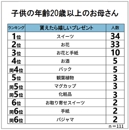 子供の年齢が20歳以上のお母さんに「母の日にどのようなプレゼントを貰えたら嬉しいですか?」と質問したところ、1位が「スイーツ」2位が「お花」3位が「お花と手紙」の結果となりました。