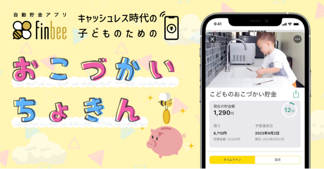 株式会社ネストエッグ(本社:東京都千代田区、代表取締役社長:田村 栄仁、以下「ネストエッグ」)が運営する自動貯金アプリ「finbee(フィンビー)」にて、キャッシュレス時代の子どもの金融教育のきっかけに活用いただける、小銭を使わずに貯金が管理できる「こどものおこづかい貯金」のパッケージ提供を4月12日から開始いたしました。親の銀行口座をfinbeeに紐づけて「こどものおこづかい貯金」を作成いただくことで、アプリ上で貯金をすることができます。