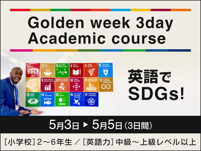 「Golden week 3day Academic course ~英語でSDGs!~」では近年、より注目度の高まっているSDGsについて、英語でもう一度考えます。イラストや動画を使用し、環境問題を自分の生活の一部としてとらえることを目標に、グループワークにも挑みます。対象レベルは、英検準2級合格以上です。