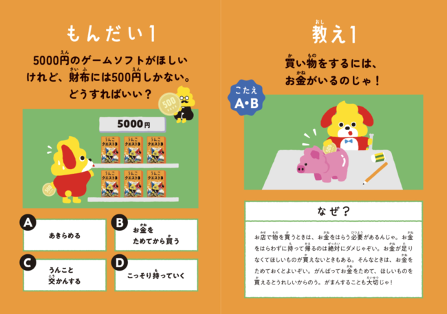 問題は、生活編・経済編それぞれ全7問が収録されており、4つの選択肢から回答を選んでいく形式。選択肢にはかならずうんこネタが登場し、くすっと笑いながら解き進めていくことができます。「うんこ(誤答)」をうっかり選択してしまっても、次のページでうんこ先生からの教えと解説を読めば、正しいお金の知識を学べるようになっています。
