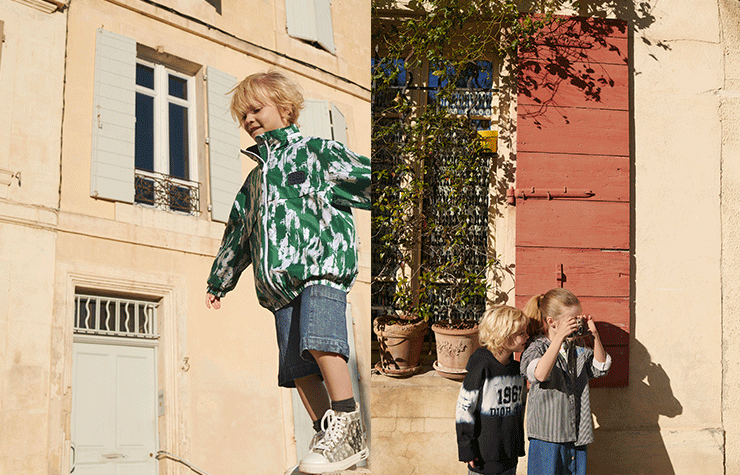 ベビー ディオール 秋冬 2022-2023コレクションにおいて、コーデリア・ドゥ・カステラーヌはメゾンのルーツ、特に南フランスからメゾン発祥の地である「30 モンテーニュ」まで、クリスチャン・ディオールにインスピレーションを与えた場所に立ち返りました。「バー」ジャケットや千鳥格子モチーフ、レオパード柄といったディオールのアイコンを子どもの世界に繊細に表現し、「トワル ドゥ ジュイ」モチーフは風車や馬、カマルグ牛、花々といった多彩なモチーフによって表現され、魅力的な旅への誘いを演出しています。大胆さと快適さを兼ね備えたこの新しいコレクションは、公式オンラインブティックおよび、全国のディオール ブティックにてお求めいただけます。