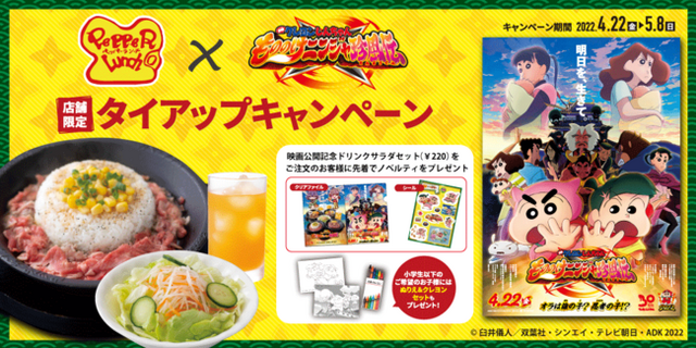 主商品(ステーキ・ハンバーグ・ペッパーライス)に映画公開記念「クレヨンしんちゃんドリンクサラダセット」をご注文の方に先着でノベルティをプレゼント!