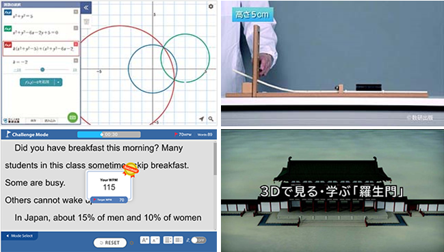 ↑数学:関数ツール、理科:実験動画、英語:速読トレーニング、国語:ムービー の例