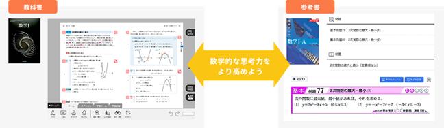 「エスビューア」上で、同一科目の複数の書籍を購入すると、購入済の書籍を連携させて使うことができます。たとえば、教科書と参考書をお持ちの場合、参考書を表示中に教科書の関連ページへ移動する、また、その逆もできるので、教科書と参考書を両方見比べ、学びを深めることができます。教育機関用と一般販売用のエスビューア商品を両方お持ちの場合は、アプリ版エスビューアで教材連携させることができます。