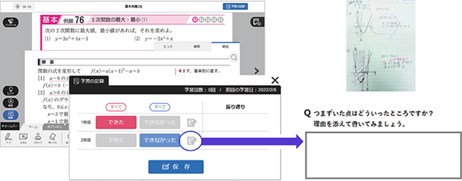 参考書や教科書の問題に、1問ごとに「できた/できなかった」の記録をつけることができます。ノートの写真やコメントもあわせて保存すると、1人1人オリジナルの「学びのアルバム」が出来上がります。学びの成長の軌跡が“見える化”されるので、見返すことで学びが促進されます。