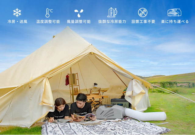 冷房機能のほか、送風機能も搭載しているため、外気温との差が大きい場所でも涼しい風を届けてくれます。微風・弱風・強風の3段階風量は切り替えができることで、好みに応じて使い分けられるのは魅力的です。モード選択、温度調整や風量調整などの操作はタッチパネルによりワンタッチして行われるので、暑さ対策をしながら涼しく夏キャンプを楽しむにも大活躍!