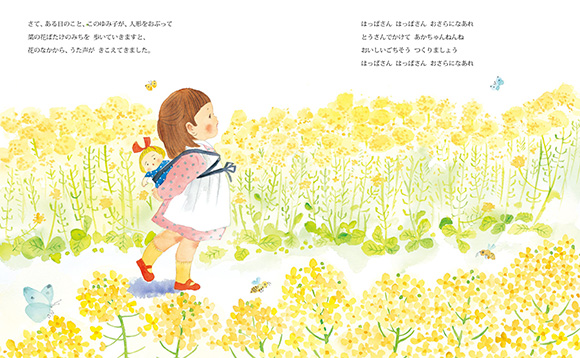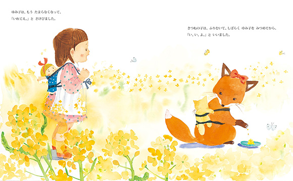 ある日、ゆみ子が菜の花畑の道を歩いていくと、きつねの子の歌声が聞こえてきました。