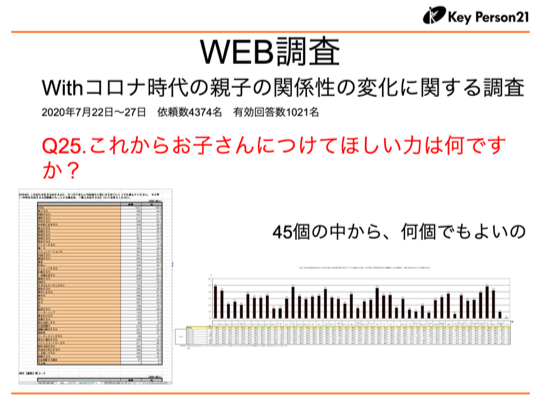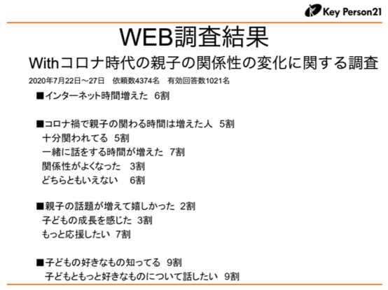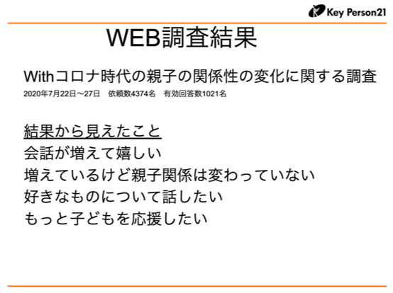 オンラインプログラム開発の契機となった、キーパーソン21による「Withコロナ時代の親子の関係性の変化に関するWEB調査(2020年7月実施、有効回答数1021名)」は下記です。