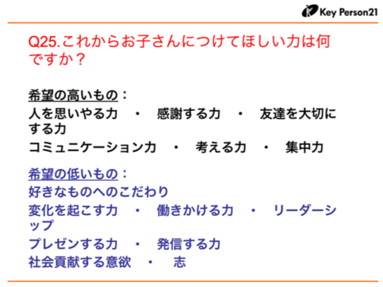 また、上記で好きなものを応援したいと思っている親は7割もいるのに下記の質問「これから子どもにつけて欲しい力は何ですか?」の回答には好きなものに関わる力は希望が低いという結果になりました。