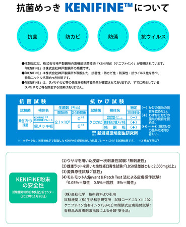 ●「KENIFINE」は、ヌメリやカビ等の発生を抑制する効果が確認されておりますが、すでに発生しているヌメリやカビ等を除去する効果はありません。