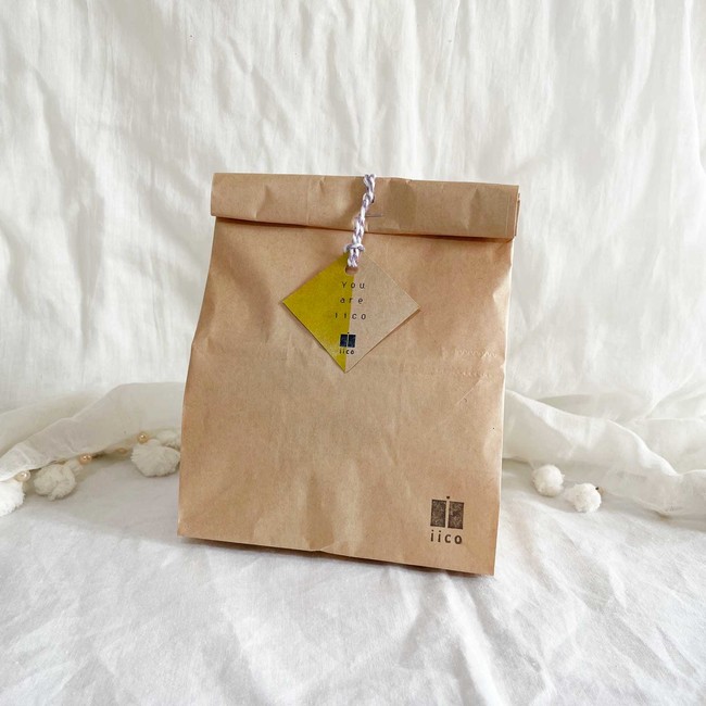 手軽にセレクトいただけるラッピングは、クラフト紙を使ったシンプルな紙バッグ。「You are iico」のタグとツイストコードがアクセントに。