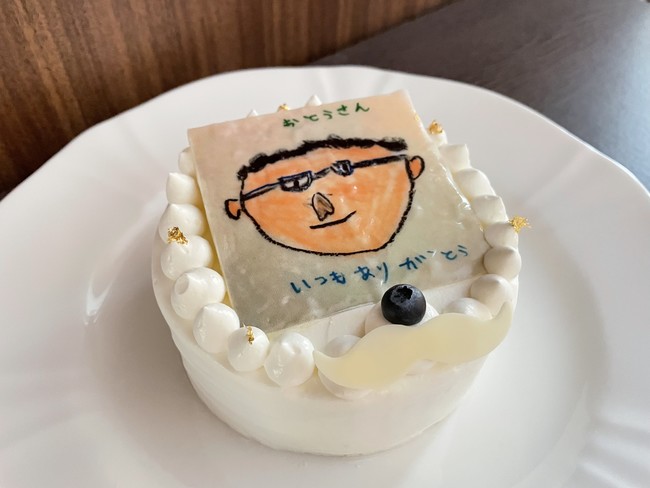 母の日ケーキ「Thanks Mom!」は、カーネーションをイメージした苺のデコレーションケーキ。父の日ケーキ「おとうさんへ」は、お子様が描いたお父さんの似顔絵やメッセージ、家族写真など、予約時に写真のデータを送付いただき、そのイラストや写真をプリントしたチョコレートをデコレーションケーキの上にのせて用意。世界で一つだけのケーキをプレゼントできます。