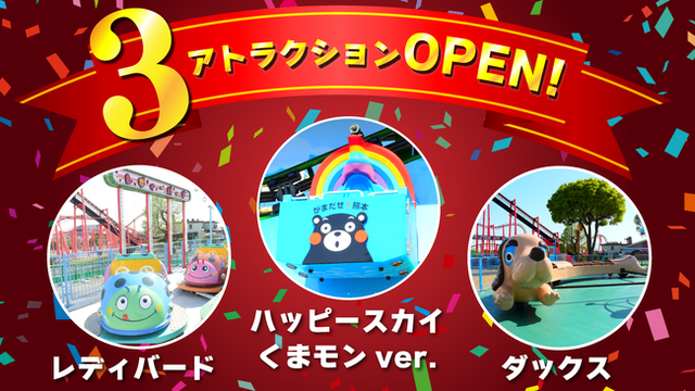 グリーンランド(熊本)は2022年4月27日(水)(※予定)に「ダックス」「レディバード」「ハッピースカイ くまモンver.」の3機種を同時オープンいたします。