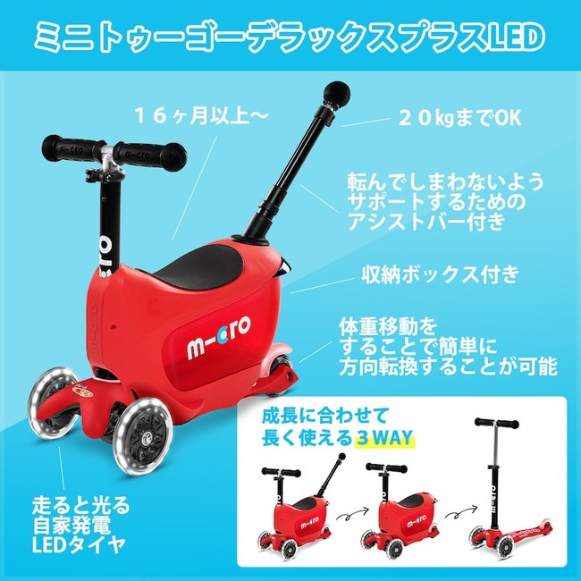 ミニトゥーゴーデラックスプラスLEDはアシストバーといすが付いているので、キックボードにまだ乗ることができない小さなお子様でも簡単にお使いいただくことができます。またいすの下部分にはおもちゃや小物が入れられる収納ボックス付きでとっても便利です。
