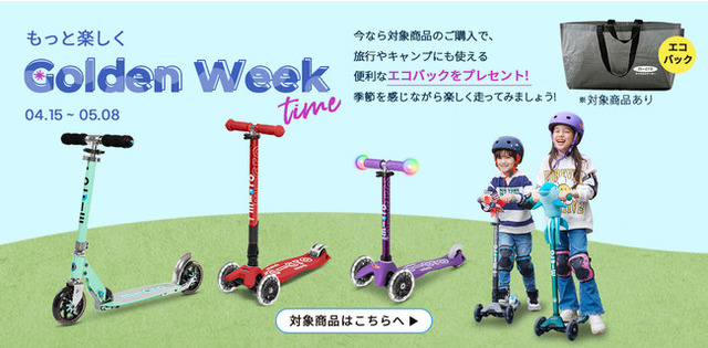 マイクロスクーター公式サイトではゴールデンウィークを迎え、この季節のお出かけやキャンプ等におすすめの3輪、2輪キックボードを紹介しております。また、対象商品を購入するとキックボードとヘルメット等を入れ、持ち運びに便利なマイクロオリジナルエコバックをプレゼントするキャンペーンを 4/15(金)~ 5/8(日)まで実施します。