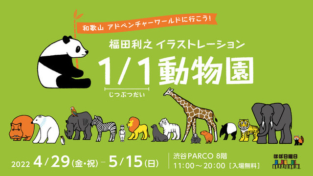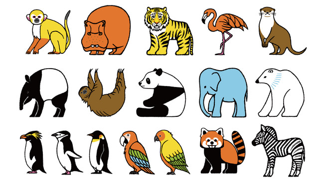 かわいさの中に、懐かしさやあたたかさ、力強さを感じるイラストを描く福田利之さんは、これまでに動物モチーフの作品を数多く描かれてきました。「アドベンチャーワールド」のために描かれた動物たちは、飼育スタッフの方々に取材をし、動物それぞれの特徴をとらえながら、福田さんらしいデフォルメで描かれています。