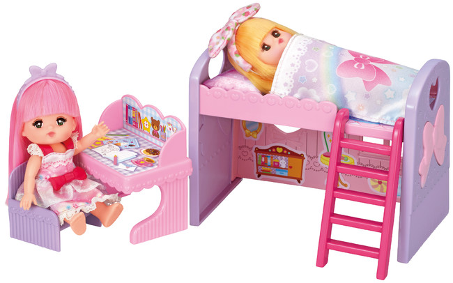 ポケットメルちゃんシリーズに「ベッド&デスクセット」が新登場。デスクに座っておべんきょうしたり、ロフトベッドでおねんね遊びができるセットです。ロフトベッドにははしごをかけて上がれます。かわいいまくらとふとんも付いています。デスクをベッドの下に収納したり、模様替えを楽しめます!ポケットメルちゃんといっしょにごっご遊びを楽しんでくださいね。