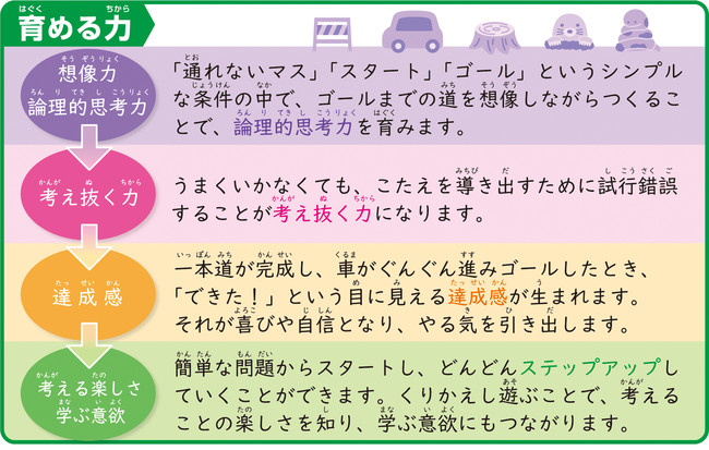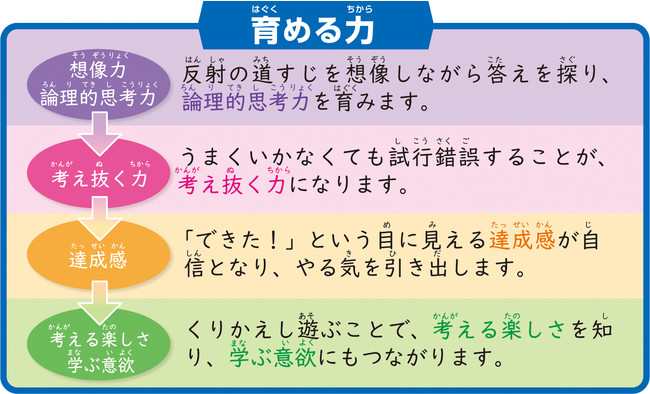 「面白い問題だけが子どもを夢中にさせる」という独自のメソッドから、教室でも人気のパズル問題を採用。「動く車」「ライトや鏡」といった楽しいパーツを用いることでゲーム感覚で夢中になって遊べます。遊びながら自分で考える力を育み、目に見える「できた!」が達成感や自信になり楽しくやる気を引き出す知育玩具です。
