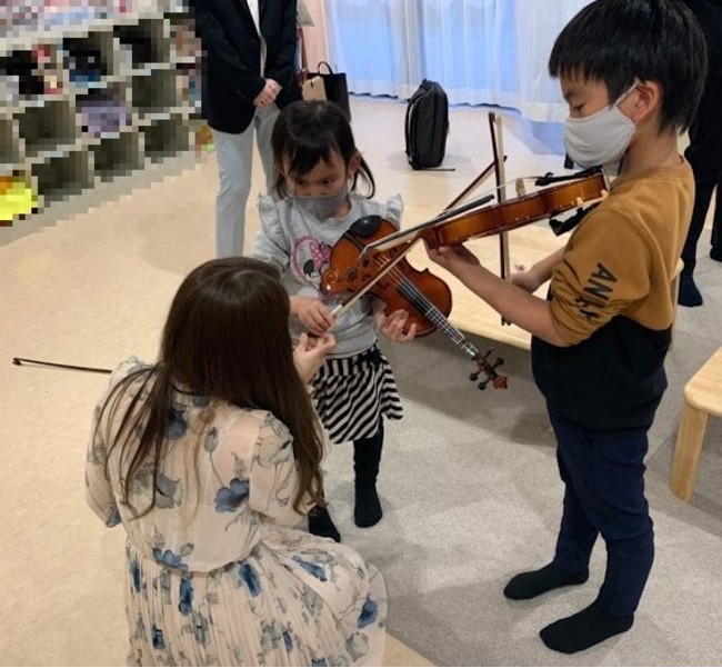 4月18日の開講を前に、12人のヴァイオリニストのメンバーが講師を務める体験会が学童クラブで実施されました。まずはヴァイオリンからどんな音色が出るのか、みんなで演奏を聴き、そのあとは楽器の構造についてや、弦と弓の扱い方を教わりました。小さな手で気を付けながらヴァイオリンに触る子どもたち。少し緊張しながらも弦に弓をこすってみると音を鳴らすことができました。最初は興味を示さなかった子どももいましたが、友達がヴァイオリンを弾く姿を見ると、「私もやりたい!」と一緒に音を鳴らしヴァイオリンを弾くという体験をすることができました。