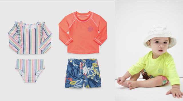 Gapのキッズベビーで展開するスイムウェアは、ワンピースやセパレート、ラッシュガードやビキニ、オールインワン、帽子付き水着セットなどデザインも豊富な上、ベビーの肌にも優しいUVカット機能 UPF 50+や、環境にも優しいリサイクルポリエステルを採用した素材など、大人顔負けのデザインと着心地の良さ、素材のクオリティにこだわったラインナップで揃います。