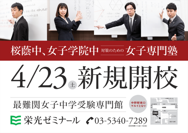 株式会社増進会ホールディングス(Z会グループ)のグループ会社、株式会社栄光(本社:東京都千代田区、代表取締役社長:下田勝昭)は、「栄光ゼミナール中野校 最難関女子中学受験専門館」を2022年4月23日(土)に新規開校します。桜蔭中、女子学院中に特化した全コース選抜制の女子専門塾で、最高の指導と学習環境で合格に導きます。現在、桜蔭中・女子学院中を目指す小学3~5年生と保護者の方を対象に、開講説明会・入塾選抜テストのお申込みを受け付けています。