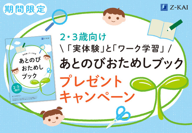 株式会社増進会ホールディングス(Z会グループ)のグループ会社である株式会社Z会は、「Z会の通信教育」幼児コースにおいて、2・3歳児向けの特別教材『あとのびおためしブック』が無料でもらえるキャンペーンを、2022年4月19日(火)から2022年11月15日(火)までの期間限定で実施します。ぜひこの機会にお申し込みください。
