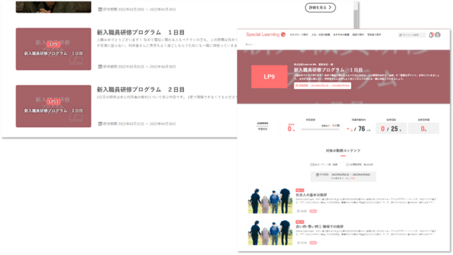 上記「新入職員研修(1日目)プログラム」の例では、対象の「新入職員」がそれぞれどの程度、研修動画を視聴完了したか、といった学習状況をひと目で確認することができます。それにより管理者が研修の進んでいないスタッフを把握し、指導にいかすことが可能です。