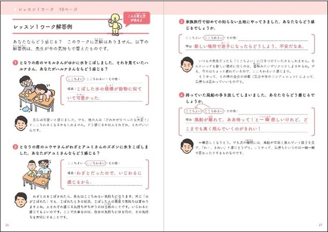18のテーマごとのワーク(課題)を通して、自分や他者の気持ちとのつき合い方を理解します。ワークでは解答例のパターンを示しているので、子どもたちが自分で考える力を育むことができます。