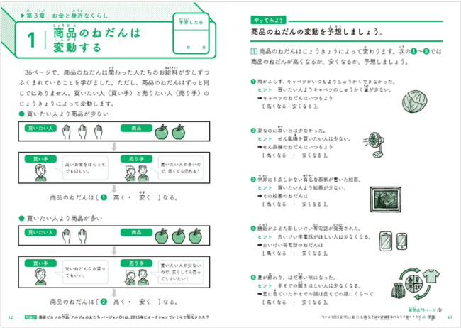 2)親しみやすいたくさんのイラストと、身近な話題を取りあげた設問の「書き込み式ワーク」です。お金の知識を得るだけでなく、自分で考えて選択したり、自分の言葉でまとめたりする練習としても活用できます。