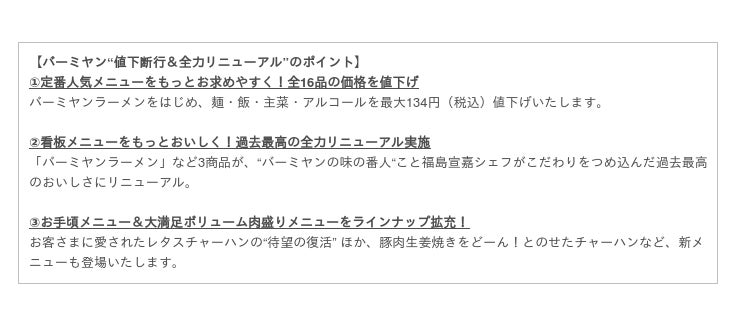 バーミヤンラーメンなど定番人気メニューをもっとお求めやすく