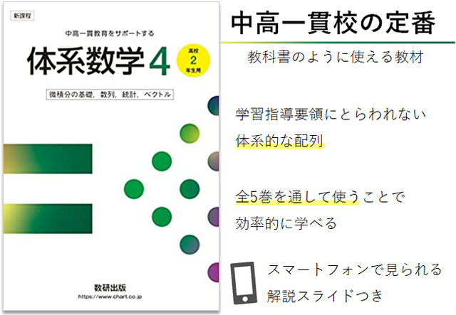 数研出版株式会社(東京都千代田区 代表取締役社長:星野泰也、以下数研)より、新刊「新課程 中高一貫教育をサポートする体系数学4」のご案内を申し上げます。体系数学シリーズは、全国の中高一貫校で広く使われている教材です。中高6ヵ年の数学で学ぶ内容を学習指導要領にとらわれない体系的な配列で編成し、教科書のように使うことができます。体系数学シリーズ全5巻を通して使うことで効率的に学べます。新課程版ではスマートフォンで見られる例題の解説スライドが付属し、動きを伴った解説で理解を助けます。
