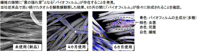 繊維にも存在していることがわかった「バイオフィルム」は、菌自らが生成する多糖やDNA、タンパク質などの複合体です。この「バイオフィルム」の中に存在する菌や汚れは、除菌洗剤・漂白剤※2、天日干しでは対処できていなかったことも明らかになりました。