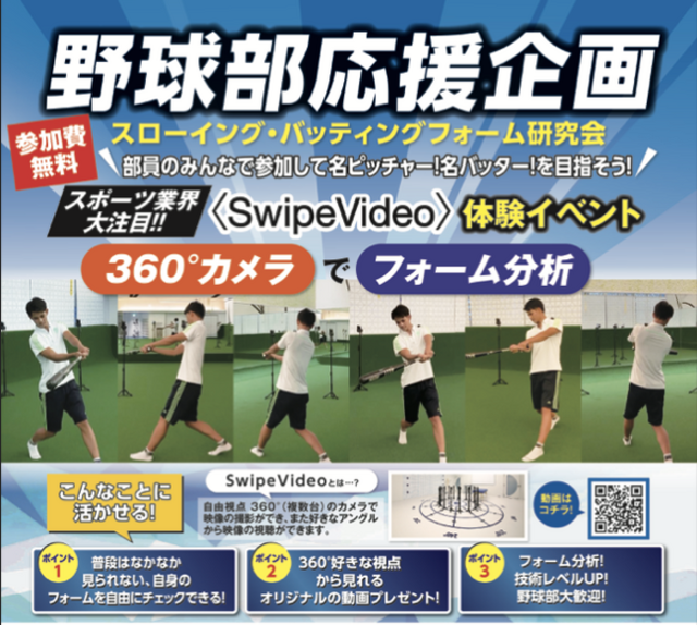 そして2021年からは、三幸学園様で所持するSwipeVideoの撮影システムをご活用され、全国の部活動へ向けたSwipeVideo撮影サービス(フォームチェック,スイングチェックなどが可能)を開始されました。