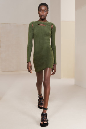 ■スタイリング: シンプル且つ機能性に優れたリブニットタンクトップとカーキ色のプリーツスカートのスタイリング