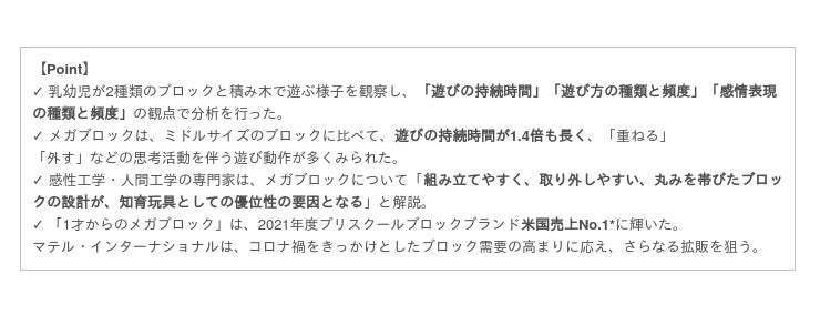 世界大手の玩具メーカー、米国マテル社の日本法人であるマテル・インターナショナル株式会社(本社:東京都千代田区、代表取締役社長:マーク・パンサール)は、プリスクールブロックカテゴリー(乳幼児向けブロック)において米国売上No.1*のブランドとなった「1才からのメガブロック」を用いた、乳幼児のブロック遊びに関する比較実験を実施しました。