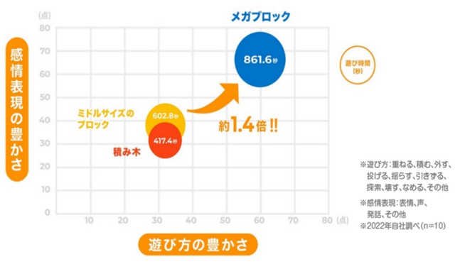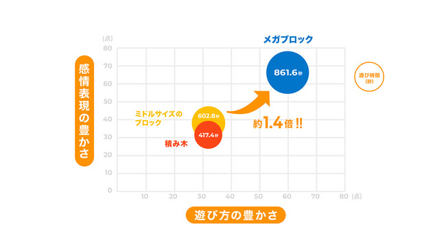 被験者の平均遊び時間は、積み木が417.4秒、ミドルサイズのブロックが602.8秒であったのに対し、メガブロックは861.6秒と、最も長く遊び続ける結果となりました。感性工学・人間工学の専門家である菅原徹先生は、「組み立てやすく、取り外しやすいストレスフリーなメガブロックの設計が、乳幼児の遊びの継続を阻害せず、夢中で遊び続けることができる要因」と解説しています。