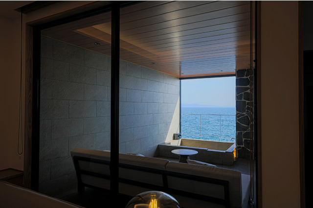 室内は窓から飛び込んでくる海の景色を愉しんでいただけるよう、色数を抑えシンプルかつミニマルな設計を目指しました。内部の色彩や照明で外部の自然環境を美しく魅せる工夫を施しています。全室に広々としたプライベートテラスと、専有露天風呂が付いた造りとなっております。