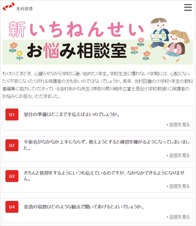 新1年生の毎日は、新しいことがたくさん。保護者が日々対応するのも大変です。さらに、コロナ禍では、先生とのコミュニケーションや保護者どうしのつながりをつくることも難しくなっているのではないでしょうか。今回、子育て経験のある方々の「こんなことに悩んでいた」「こんなことを知りたかった」という声を集め、吉村あかね先生に答えていただきました。保護者のみなさんのお悩みを少しでも解決し、「これで大丈夫」と安心して1年生の1学期を過ごせる、そんなウェブコンテンツをめざしました。「新いちねんせいお悩み相談室」、ぜひご一読ください。(光村図書編集部・野口)
