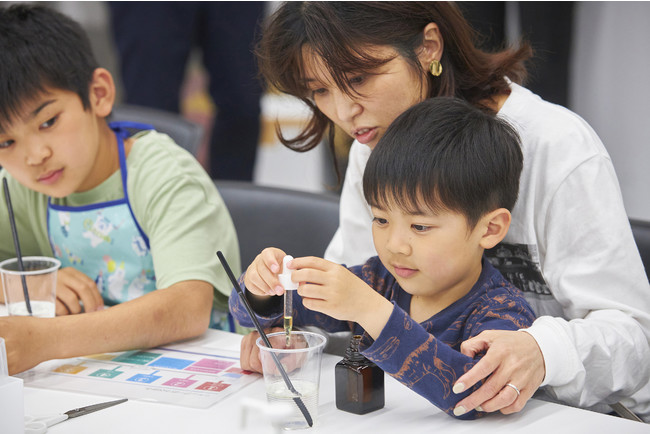 お子様の好みに合わせた香料選びから始まり、材料をかき混ぜたら世界に一つだけのシャンプーが完成。容器にはシールを貼って、マイボトル作りを楽しみました。