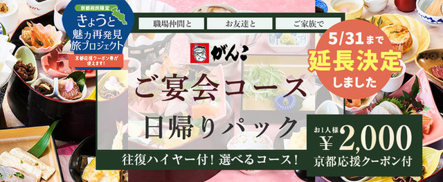 京都府内のがんこ3店舗から選べるコース。往復ハイヤーとお食事がセットになったパックツアー♪ きょうと魅力再発見旅プロジェクトを利用してお得にお食事が楽しめるプランです。