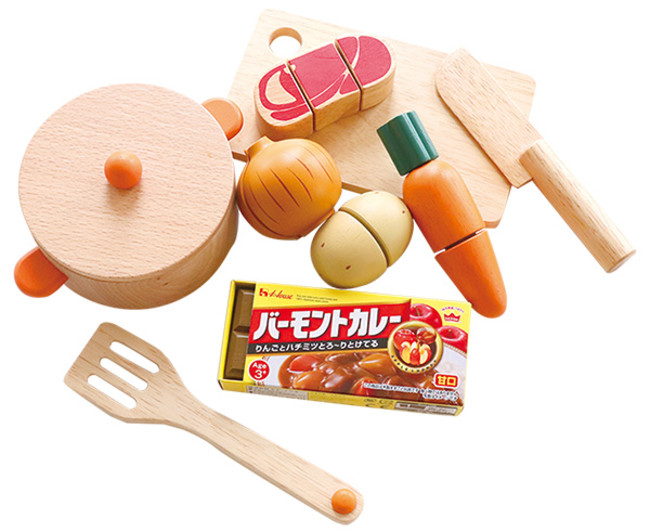 「ままごと バーモントカレー<甘口>」を含んだ、たまねぎやにんじんなどの食材とおなべや包丁などの調理器具の合計9点がセットになったアイテム。