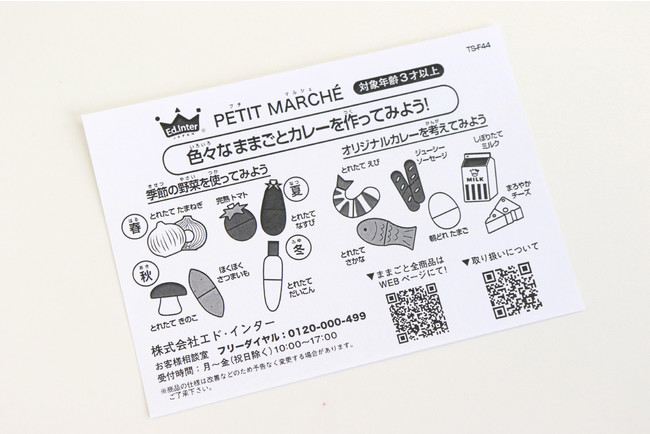 色々な食材を提案するままごと紹介シート入り。食材の組み合わせや旬がたくさんあることを知り、ままごとカレーを通してより踏み込んだ食育の一歩になります。